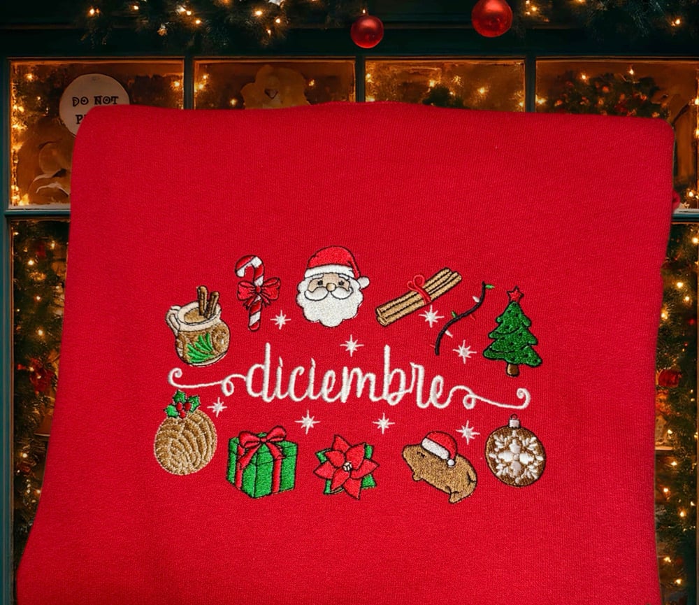 Our “diciembre” sweater is back with mini embroidered churros, conchas, ponche y cositas navideñas. A sweet little touch of holiday joy.